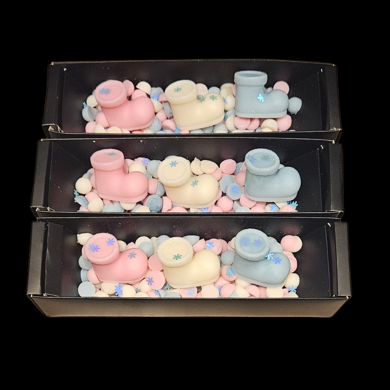 Cute little santa boots resting on snow in the dawn, reflecting the icy hues of blue and pink with a scattering of snowflake glitter